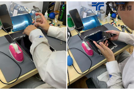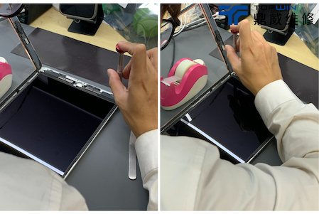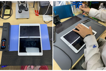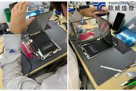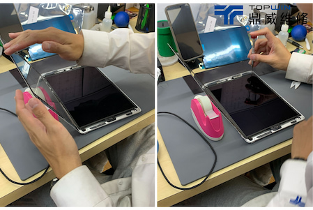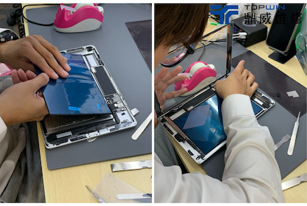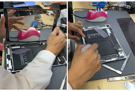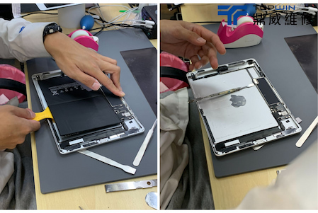 在確認是電池問題後便著手開始進行拆機更換電池,首先需要將平板至於加熱墊上加熱以便軟化在機身內部的膠條,加熱過後便可以於玻璃邊邊用上使用拆機片拆機。