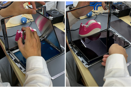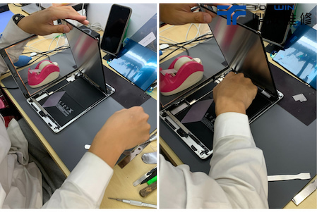 掀開觸控玻璃後便會看到液晶,由於iPad 8的玻璃以及液晶是分開的,不像手機是能夠整片螢幕掀起來。