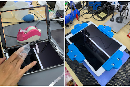 將觸控玻璃和上前用低黏性膠帶把液晶上的灰塵清乾淨,最後再夾上平板專用夾做加壓就大功告成了。