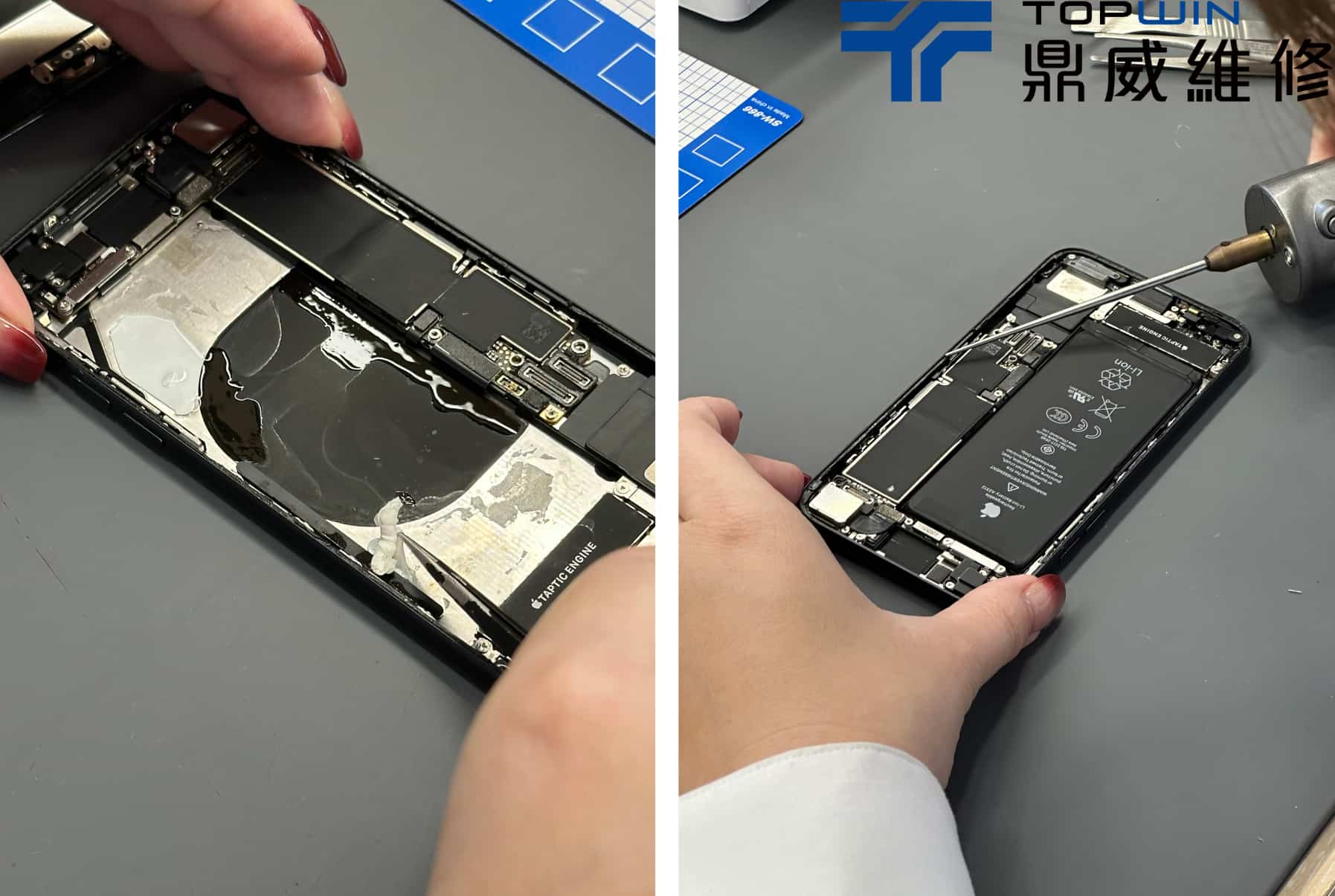 拆下舊電池後清除殘膠以及邊框周邊破損的防水膠。